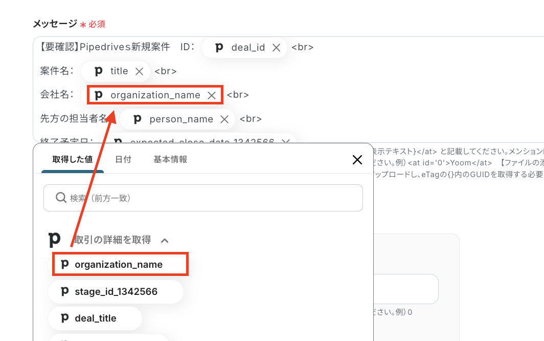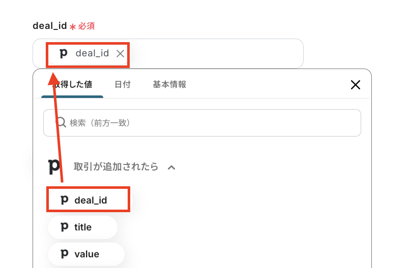 入力欄をクリックして表示される「取得した値」の「取引が追加されたら」内にある、「deal_id」を選択してくださいね!