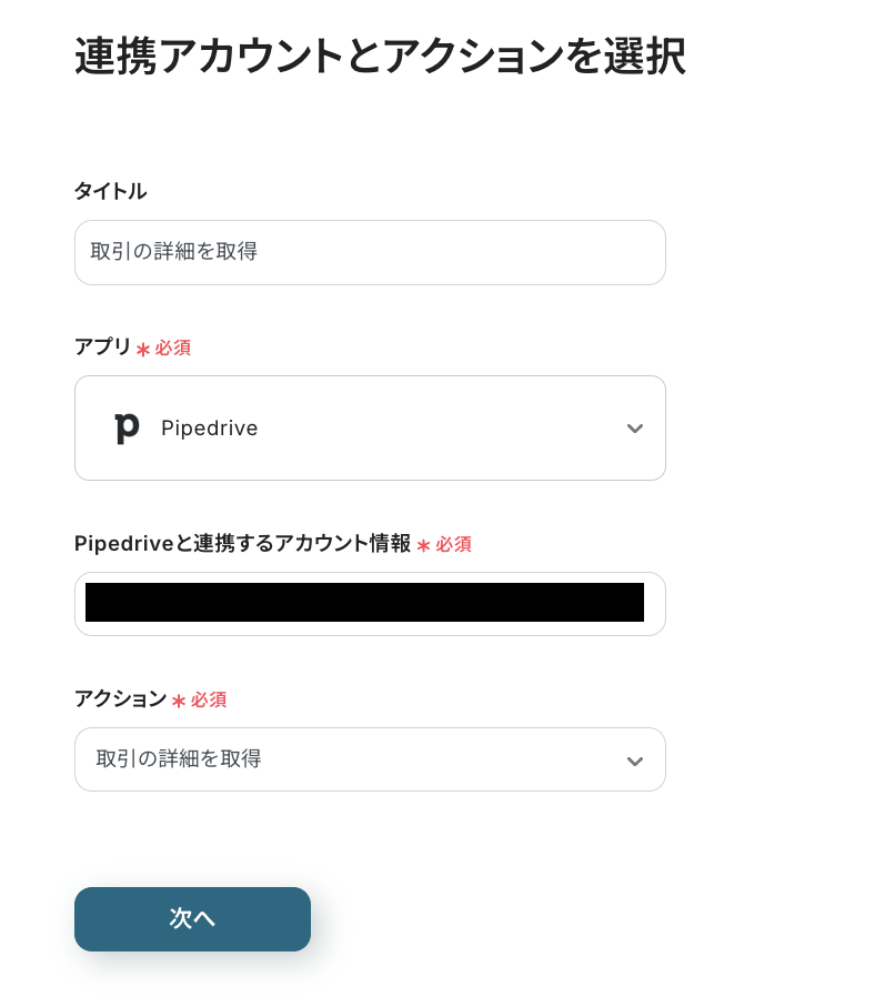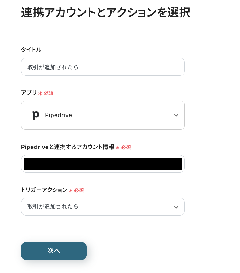 タイトルと連携するアカウント情報を任意で設定し、アクションはテンプレート通りのまま「次へ」をクリックして進んでください。