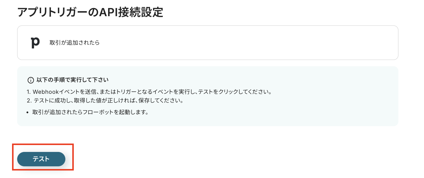 下図の画面で再度「テスト」をクリックし、テスト用に追加した取引情報が「取得した値」にアウトプットとして抽出されることを確認しましょう!