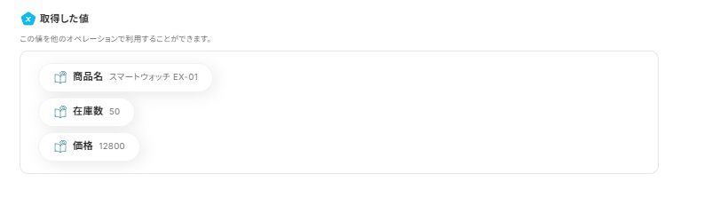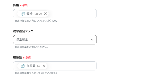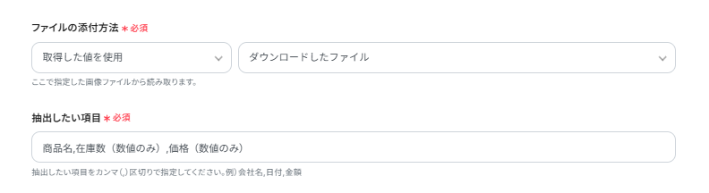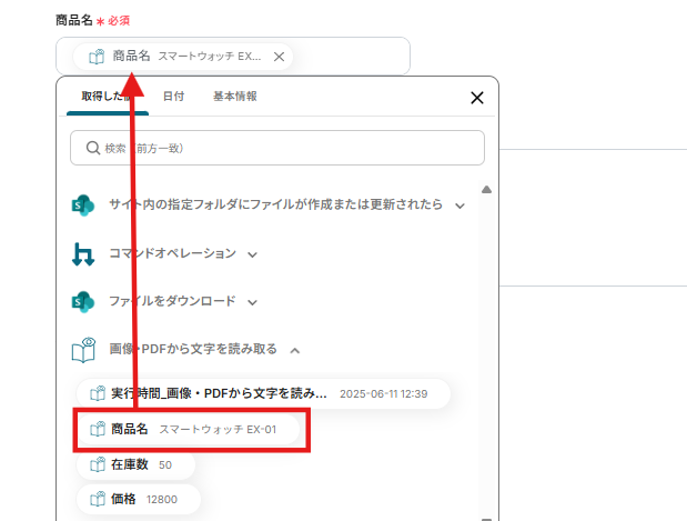 「商品名」には以下のようにOCRで読み取った内容を入力します。