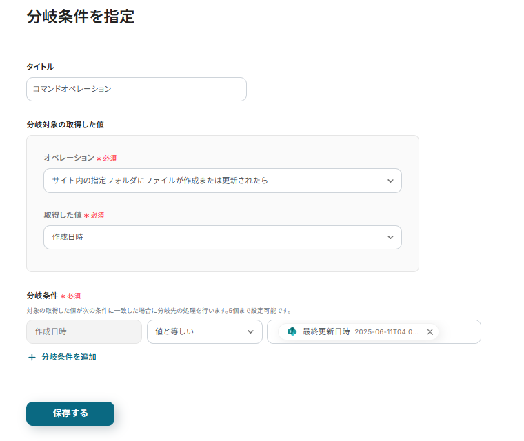 作成日時が最終更新日と同じ場合に次のフローへ進むように設定を行います。