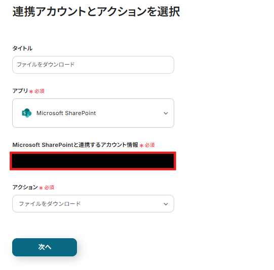 連携アカウントとアクションを選択する画面が表示されるので、今回連携するMicrosoft SharePointのアカウントを確認し「次へ」をクリックします。