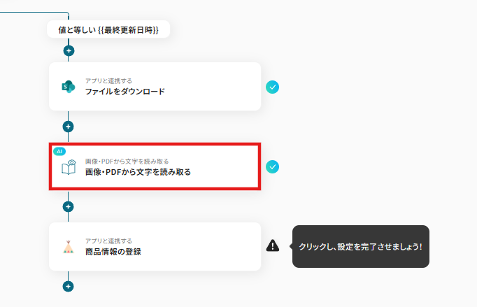 「Microsoft SharePointで特定条件に合う新商品の資料が格納されたら、OCRしてBASEに商品情報を登録する」ワークフローは、新商品の資料が条件に合致した際の登録作業をサポートします。