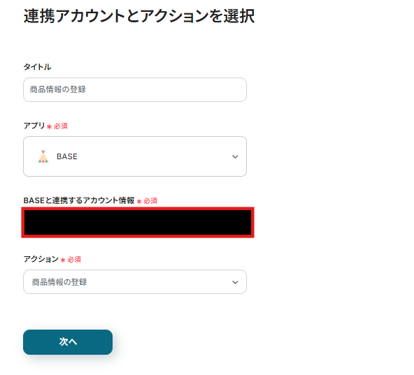 連携アカウントとアクションを選択する画面が表示されるので、今回連携するBASEのアカウントを確認し「次へ」をクリックします。