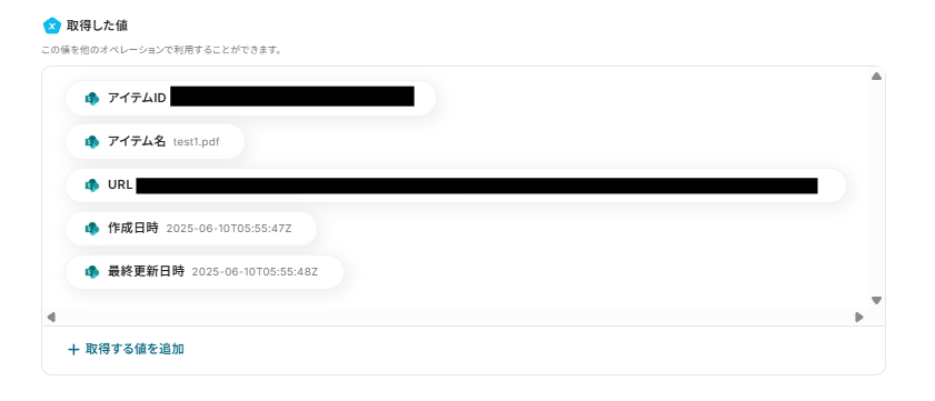 入力後「テスト」をクリックし、実際にMicrosoft SharePointから取得した情報が表示されているか確認しましょう。