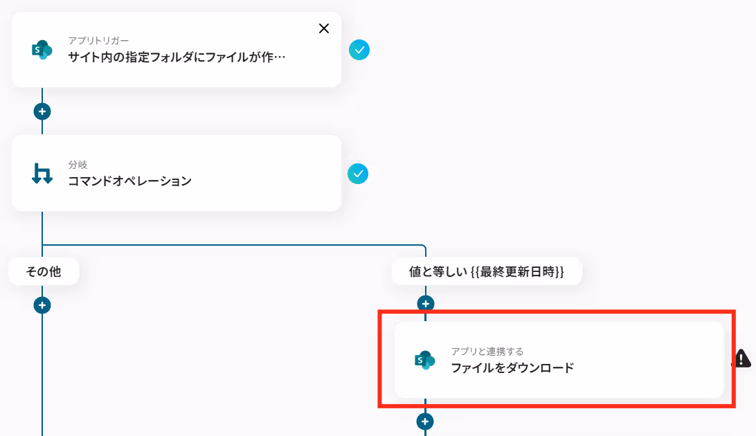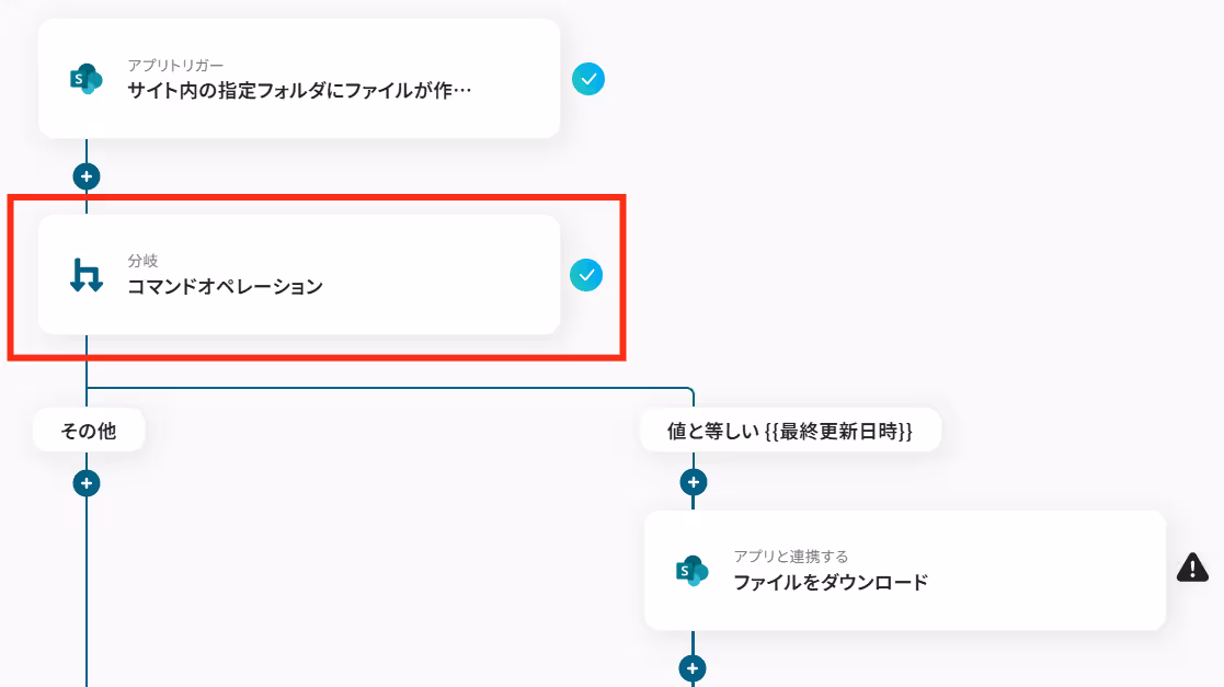 まずは「値と等しい{{最終更新日時}}」の直下にある「+」マークをクリックし、分岐設定を追加します。