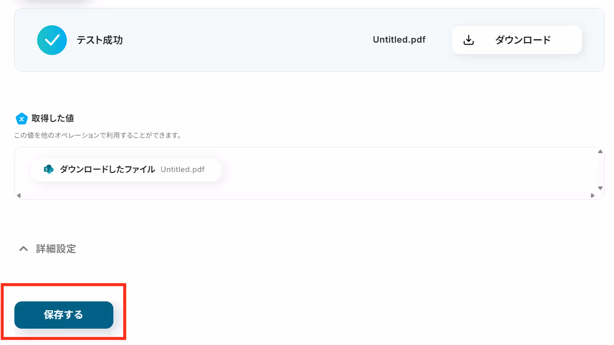 テストに成功すると「取得した値」に反映され、Microsoft SharePointでサイト内の指定フォルダに作成されたファイルの情報が確認できます。ここで取得した値を活用し、この後の設定を進めていきます!