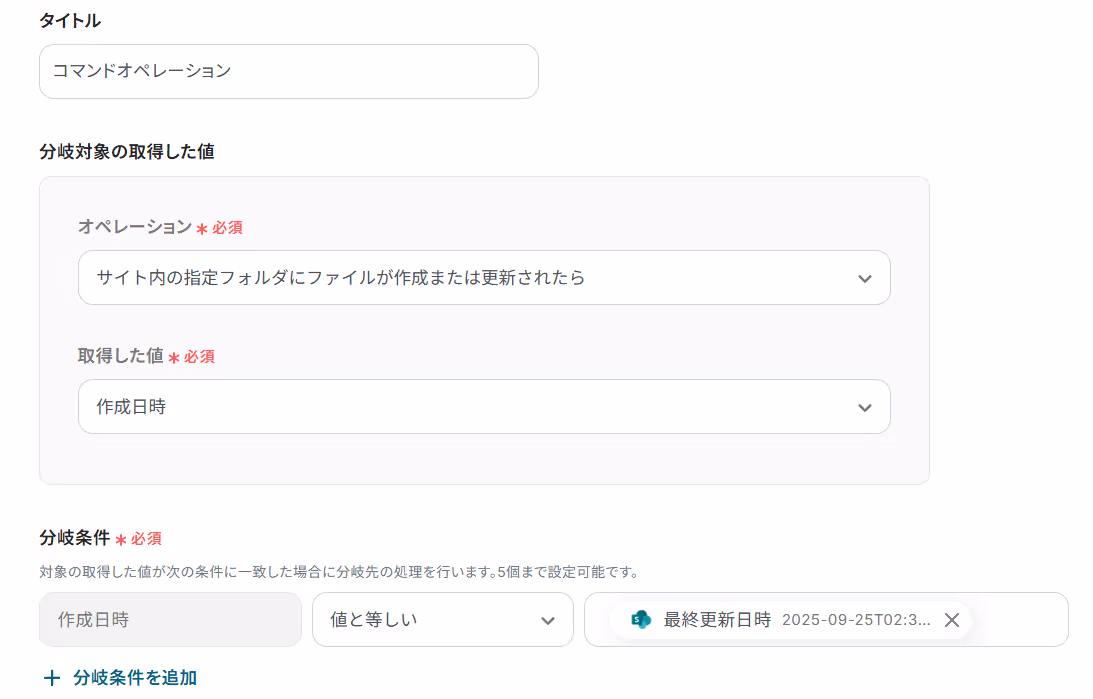 今回はMicrosoft SharePointでファイルが作成されたときにフローボットが起動するようにしたいので、「分岐条件」が「作成日時」と「最終更新日時」が等しいときに設定されています。