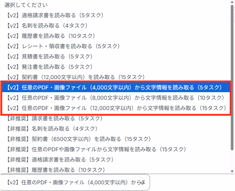 デフォルトでは「任意のPDF・画像ファイル(4,000文字以内)から文字情報を読み取る(5タスク)」が設定されていますが、任意のアクションを選択可能です。
