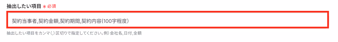 「抽出したい項目」にはデフォルトで「契約当事者,契約金額,契約期間,契約内容(100字程度)」が設定されていますが、目的に合わせて任意の項目を設定しましょう。