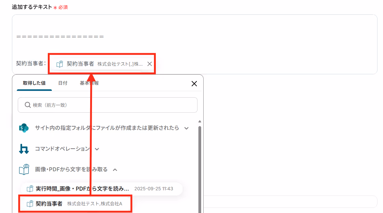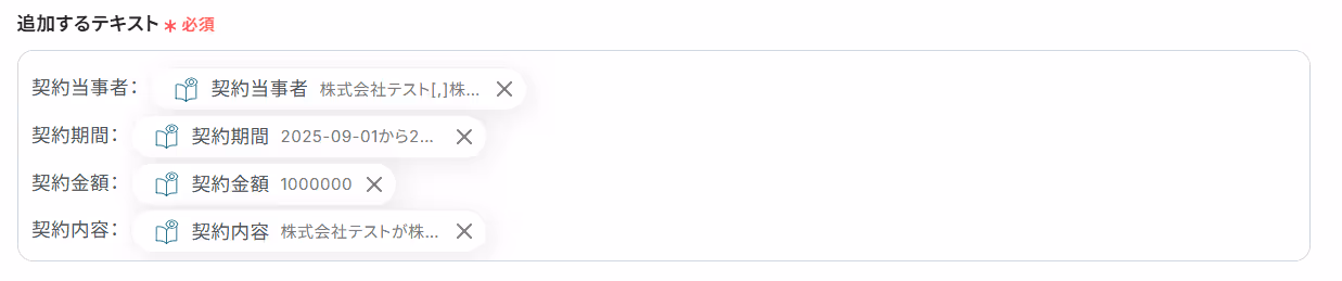 取得した値の他、テキストを直接入力することもできますが、直接入力した箇所は固定値のため定型文となります。