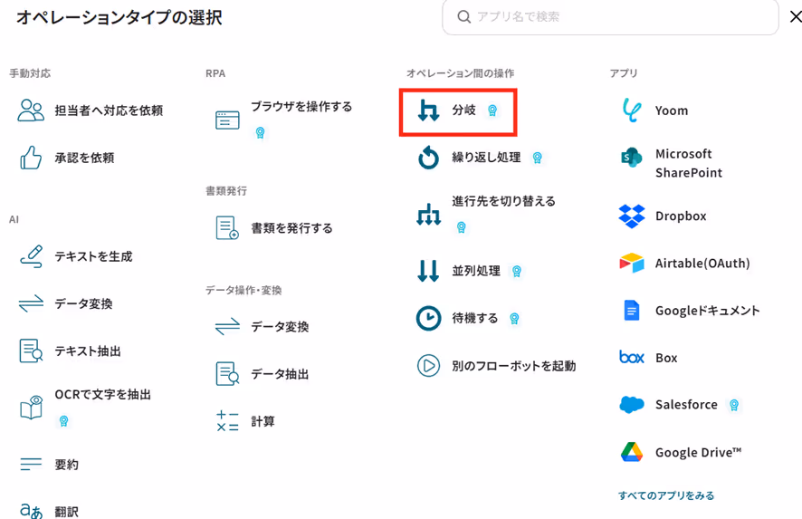 「分岐する」オペレーションは、ミニプラン以上でご利用いただけます。フリープランで利用するとエラーになってしまうのでご注意ください。