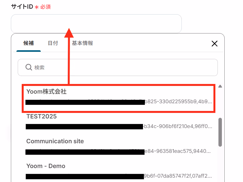 先ほどアップロードした「サイトID」と「ドライブID」を候補から選択しましょう。