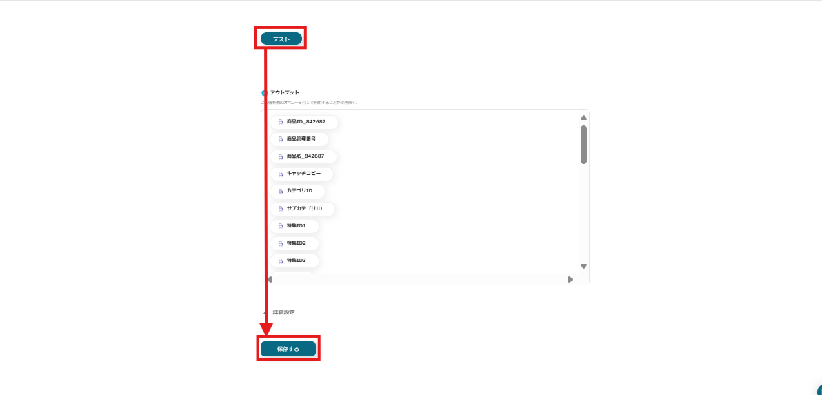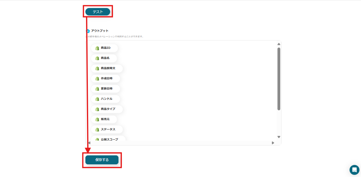 「テスト」ボタンをクリックすると、先ほど登録した商品情報がアウトプットに表示されるので、正しく反映されたのを確認できたら「保存する」をクリックしてください。