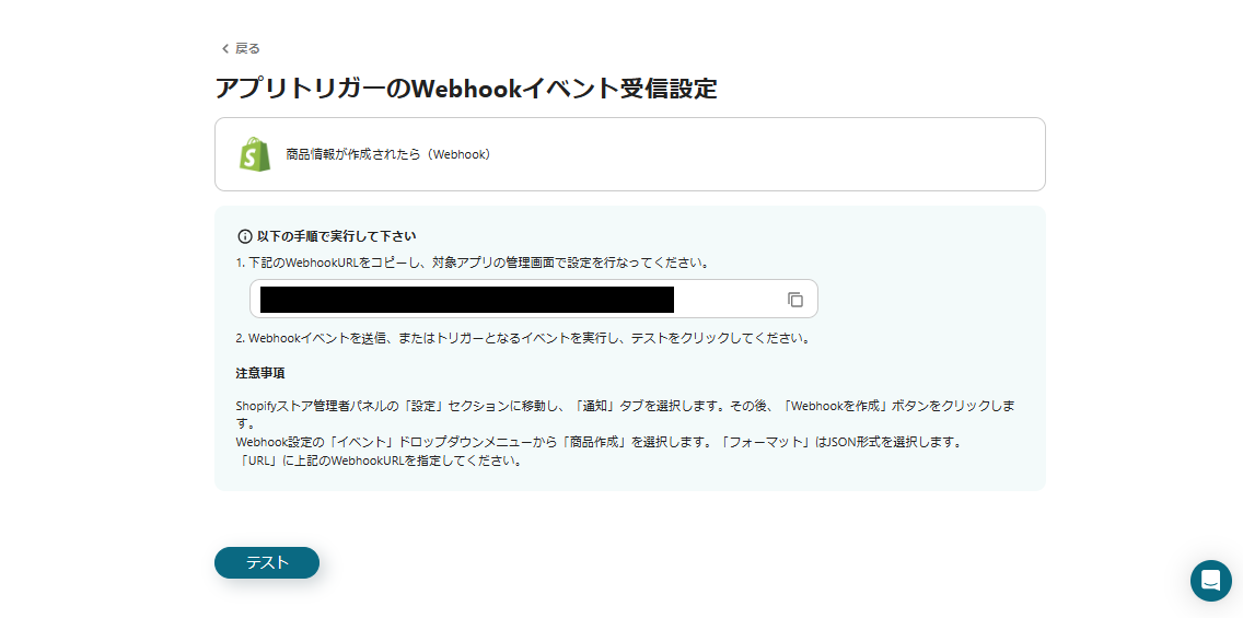 上記画面のWebhookURLをコピーして、Shopifyの管理画面で設定を行なってください。