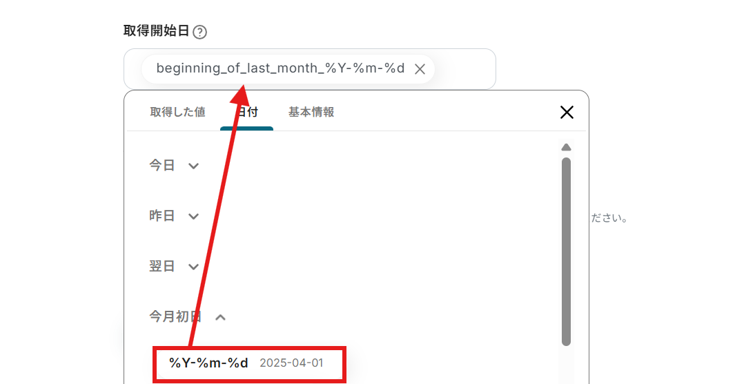 取得開始日、取得終了日:デフォルトでは、期間は今月初日から今日までとなっています。変更したい場合は以下のように入力欄をクリック→日付から引用しましょう。