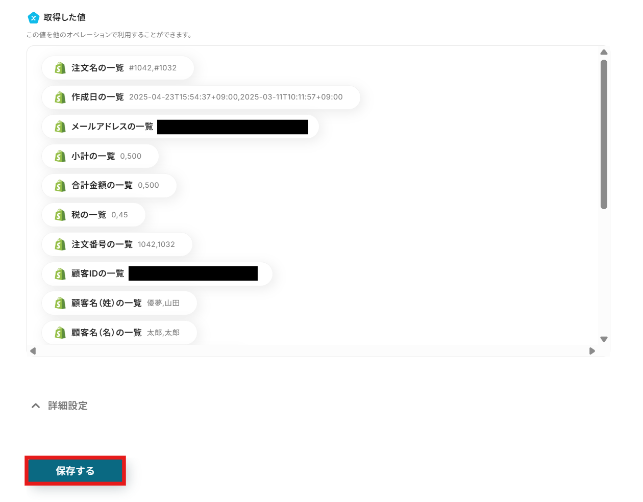 テストが成功すると「テスト成功」の画像が表示され、Shopifyから取得した情報を引用できるようになります。