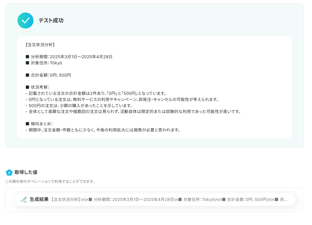 テストが成功すると、以下のように注文状況を分析した結果が表示され、生成結果を引用できるようになります。