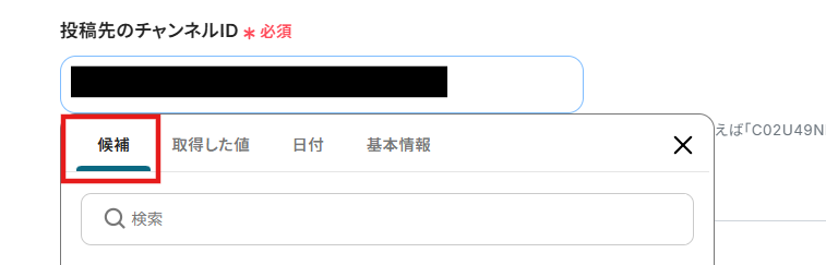 投稿先のチャンネルID:入力欄をクリックすると候補が表示されるので、その中から選択しましょう。