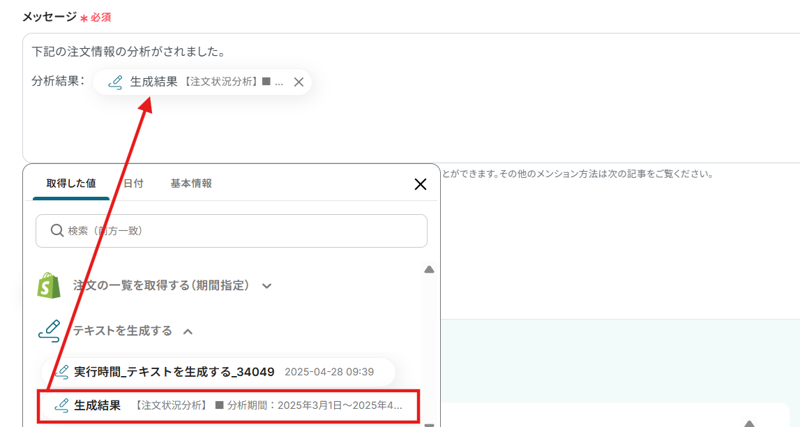 メッセージ:編集欄をクリックすると先ほど生成したテキストを引用できます。Shopifyの情報を引用することも可能です。