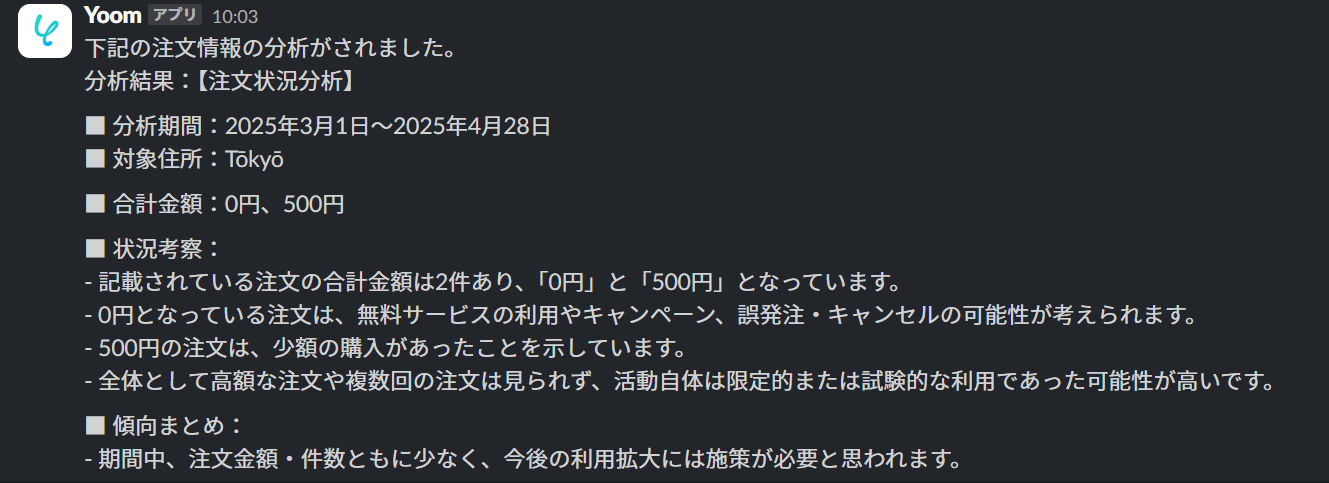 以上が、毎週Shopifyの注文情報を取得し、AIに分析・戦略提案を出力させSlackに通知する方法でした!