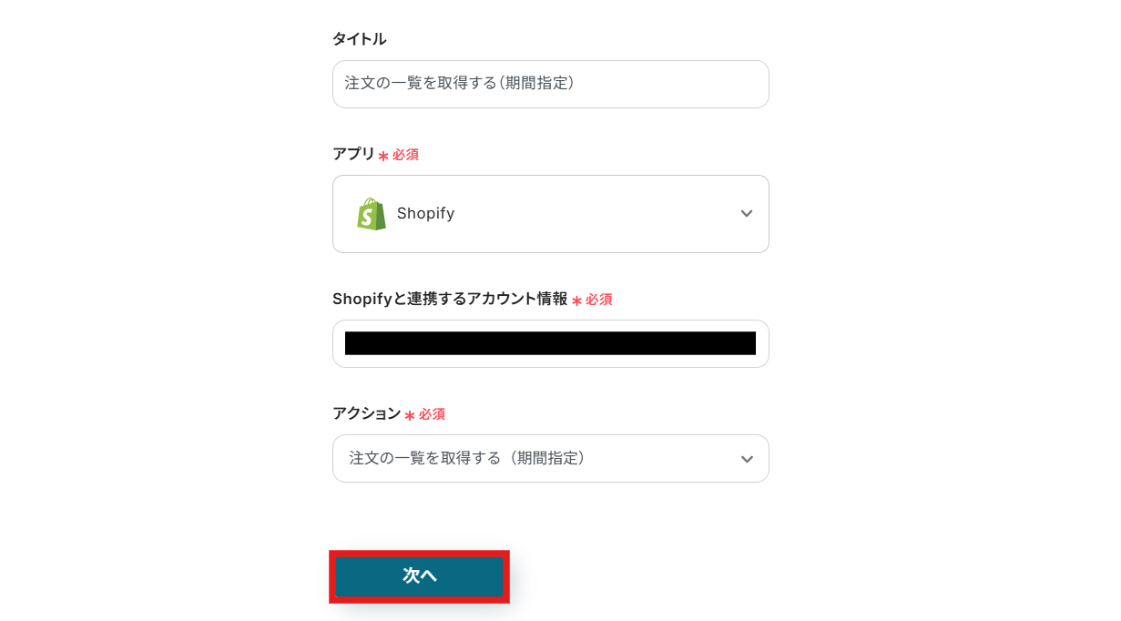 アクションは「注文の一覧を取得する(期間指定)」を選択します。