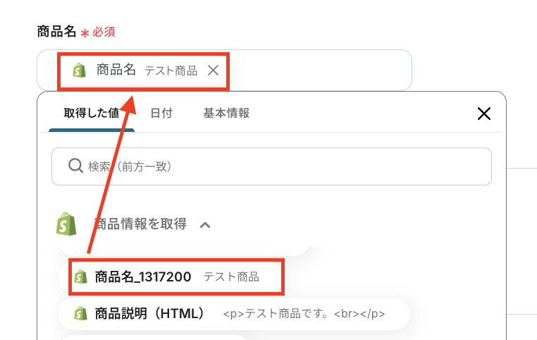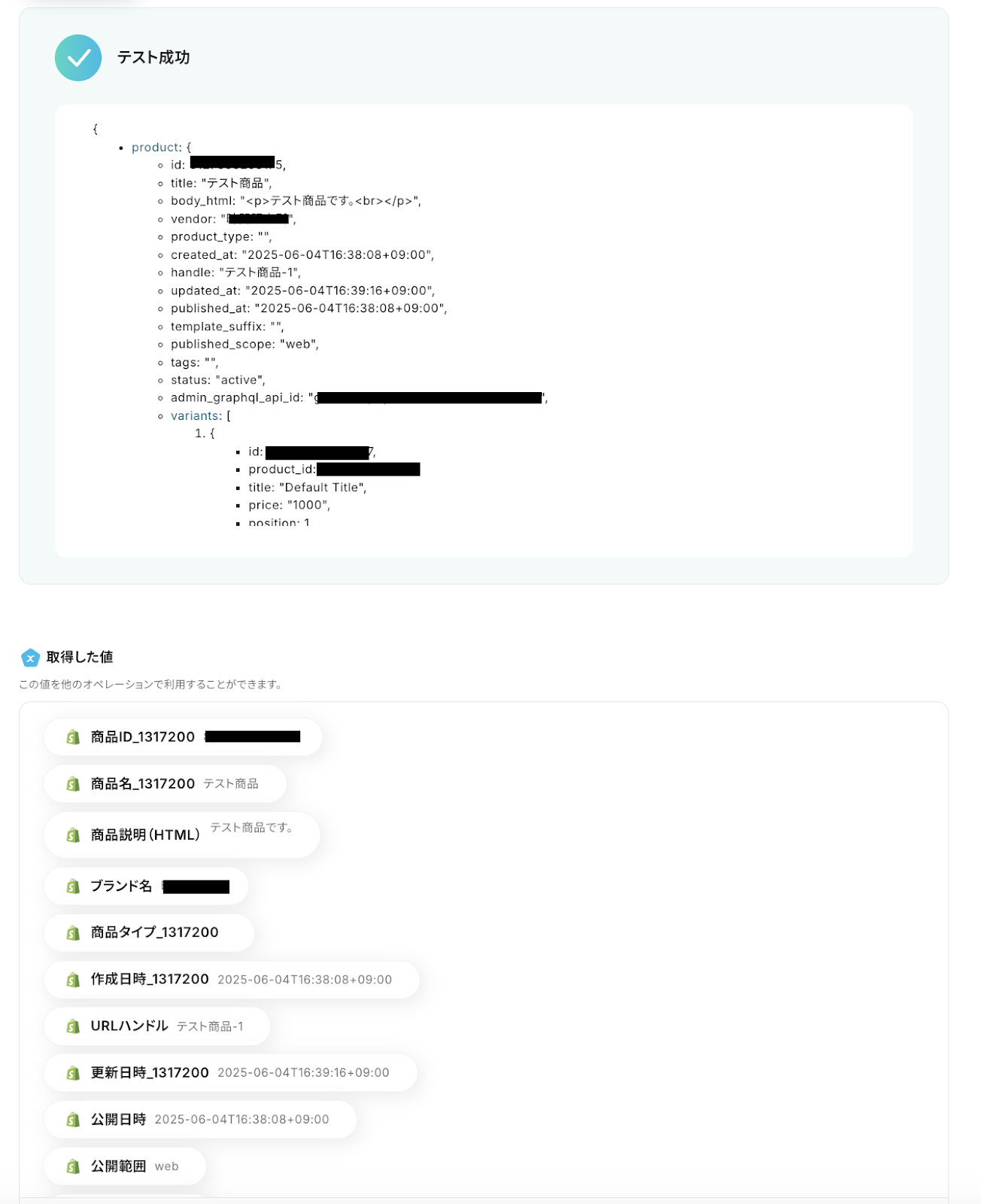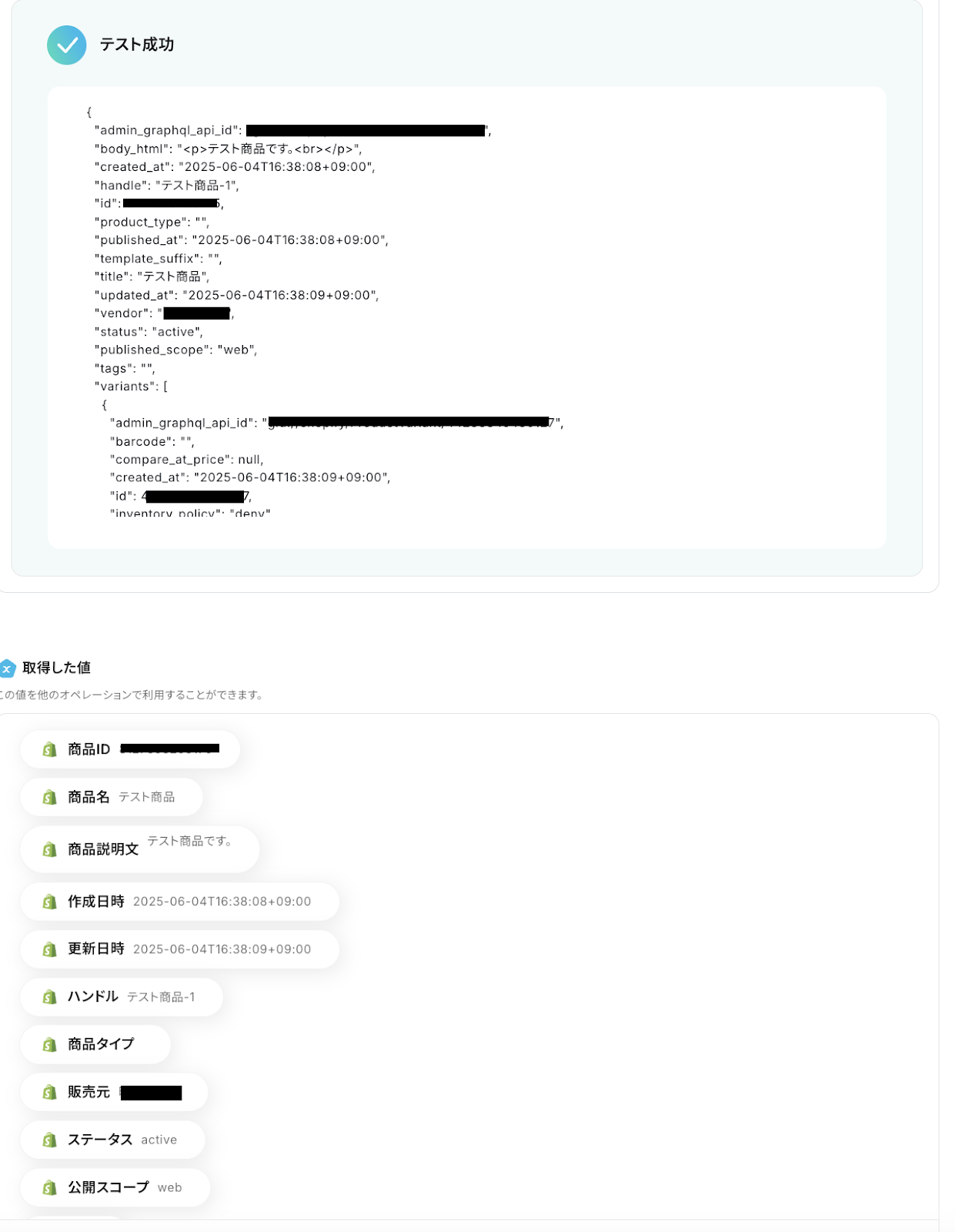 テストが成功すると先ほど作成した商品情報が、「取得した値」にアウトプットとして抽出されるので、内容を確認しましょう。