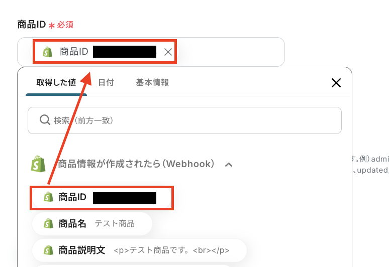 「商品ID」をステップ3で取得したアウトプットを使って下図のように設定します。