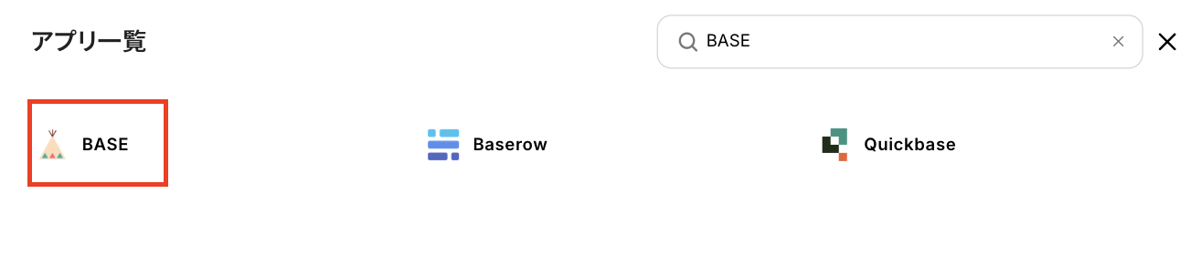 検索窓でBASEと入力し、表示された候補からBASEを選択します。