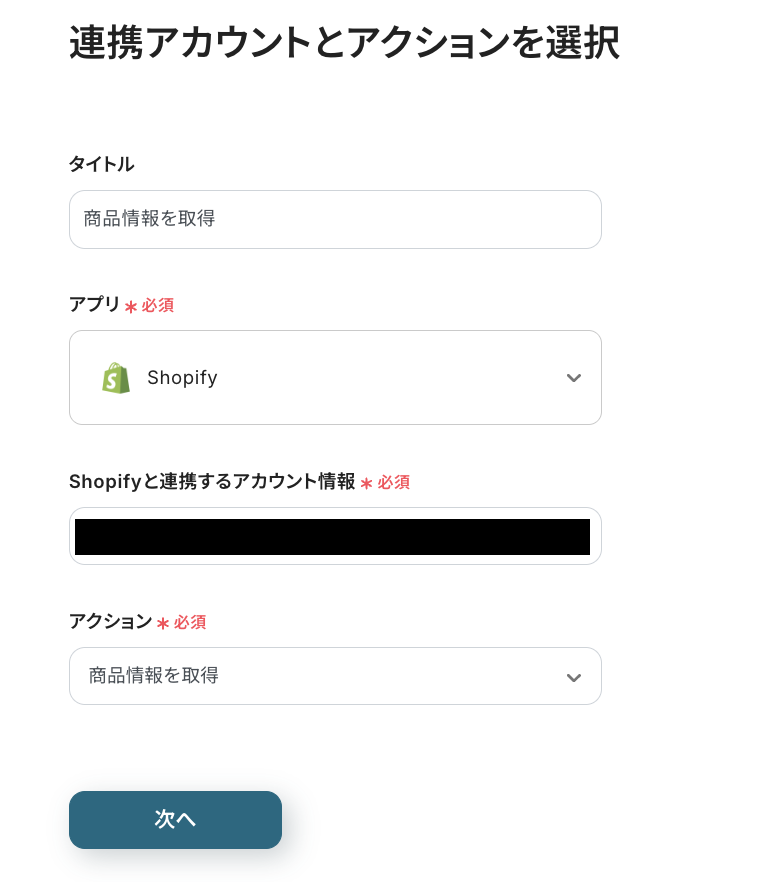 アクションは変更せず「商品情報を取得」のままにして、「次へ」をクリックしてください。