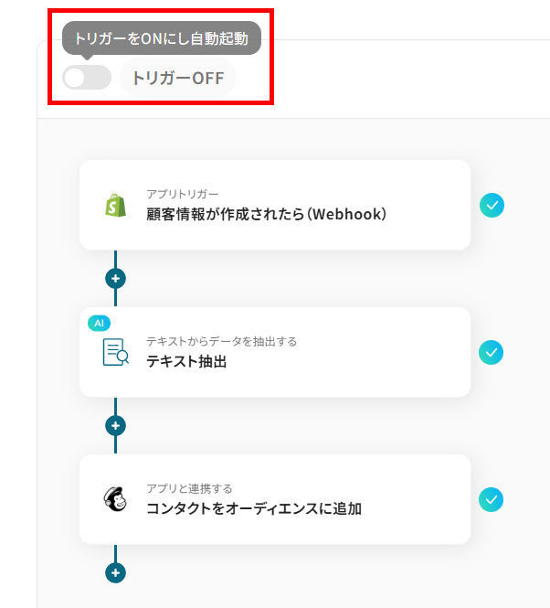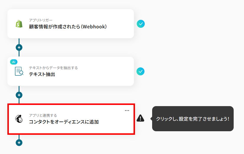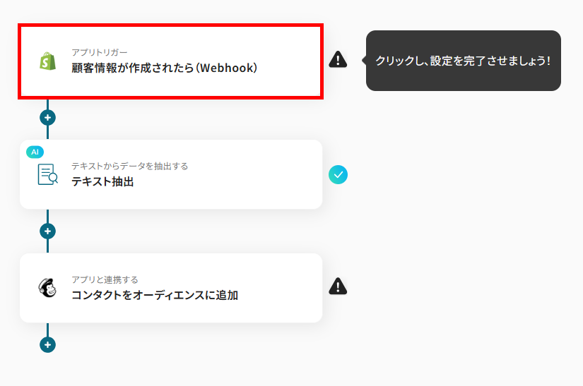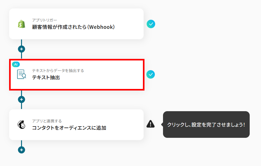 - Shopifyのトリガー設定、テキストの抽出設定およびMailchimpのアクション設定