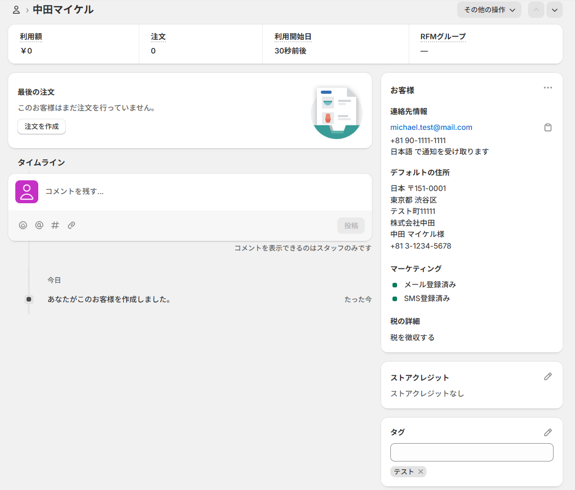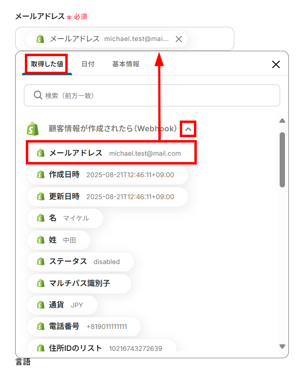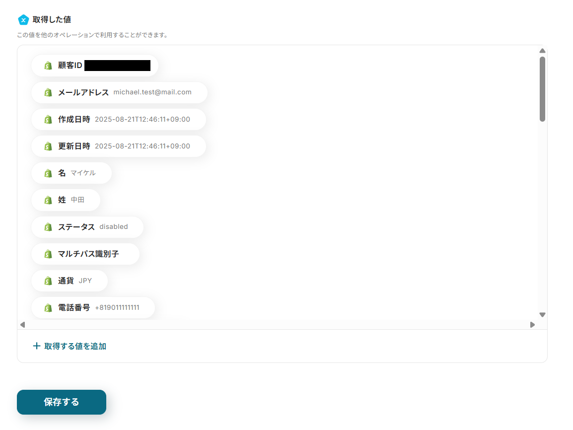 テストが成功すると、Shopifyに登録した顧客情報が取得されます。