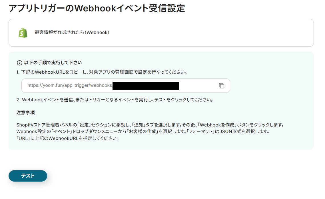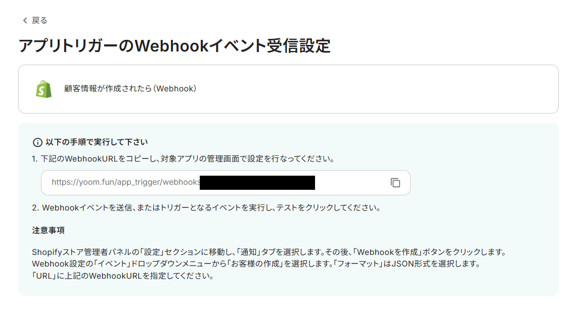 表示されているWenhookURLをコピーしたら、注意事項を参考にしてShopifyに設定してください。