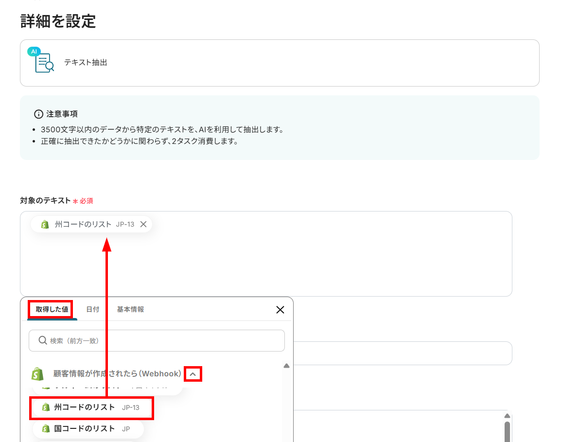 対象のテキストに、取得した値から「州コードのリスト」を設定してください。