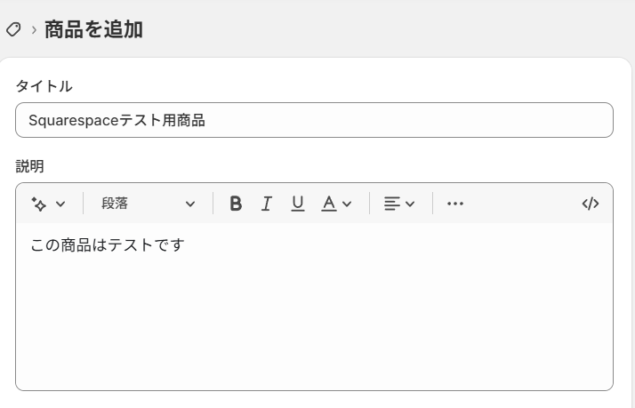 Webhookの設定ができたら、そのままShopifyでテスト用の商品情報を作成してください。 今回は例として、以下のような商品情報を作成しました。