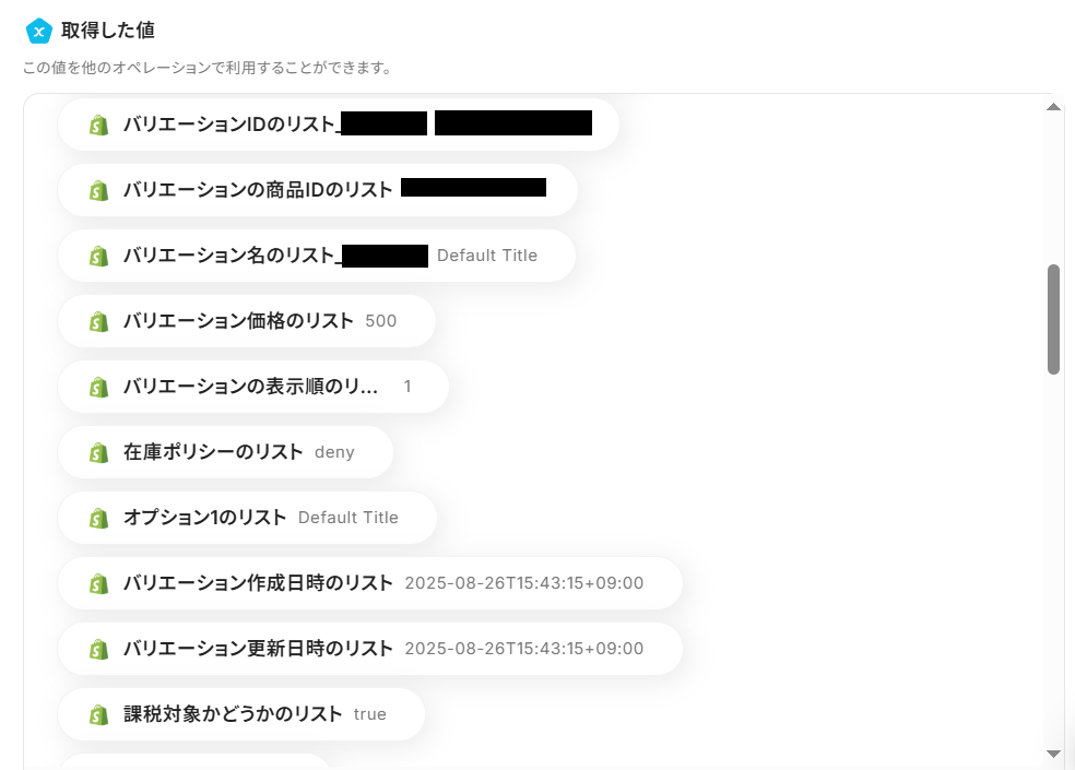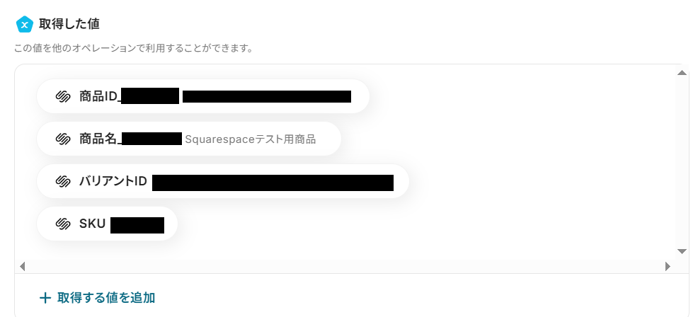 【Tips】 以下の画像に表示されている取得した値=アウトプットはこの後のステップで活用でき、Squarespaceで商品を作成する際にも利用できます。 また、アウトプットを活用して設定を行った箇所はフローが起動する度に自動で最新の情報で登録されます。