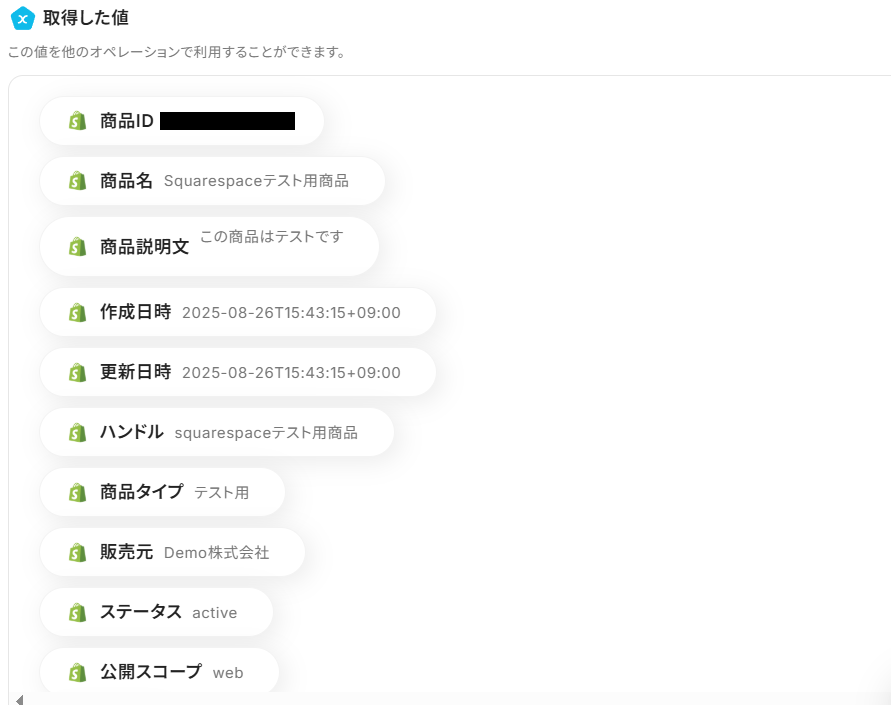 Yoomの設定画面に戻って「テスト」ボタンを押してみましょう。「取得した値」として、以下のようにShopifyで作成した商品の情報が反映されていれば成功です! Yoomではこの「取得した値」を、フローボット内の他のアクションで活用できる「アウトプット」と定義しています。