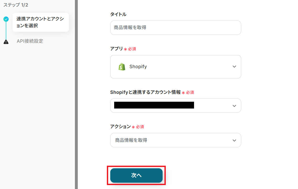 タイトルを任意で設定し、Shopifyと連携するアカウントやアクション内容を確認したら「次へ」を押してください。