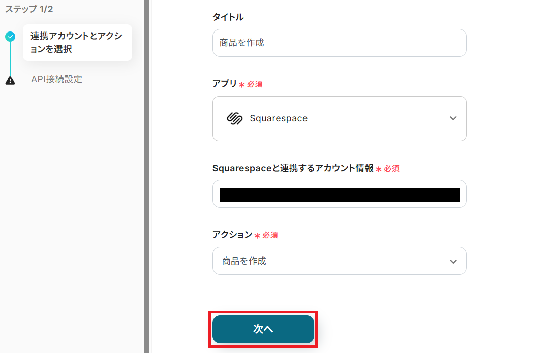 タイトルを任意で設定し、Squarespaceと連携するアカウントやアクション内容を確認したら「次へ」を押してください。