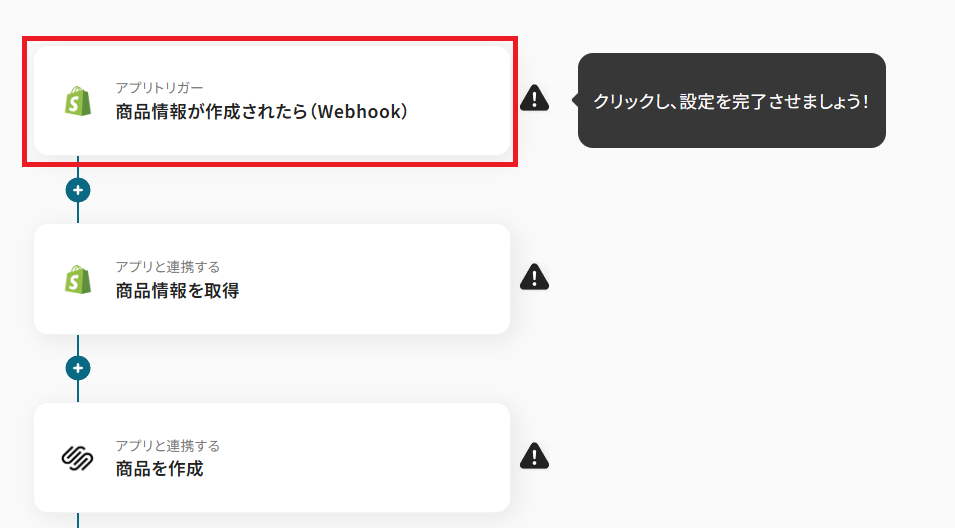 Yoomのフローボットを動かす引き金となるアクションのことを「アプリトリガー」と呼びます。 今回のフローボットでトリガーになっている、Shopifyの「商品情報が作成されたら(Webhook)」というアクションを設定していきましょう。