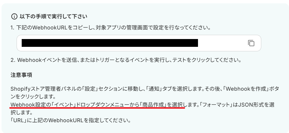 Shopifyの注文情報を受け取るために、YoomのWebhookをShopifyに設定していきます。下の画面からWebhookURLをコピーし、Shopify側にペーストしてください。