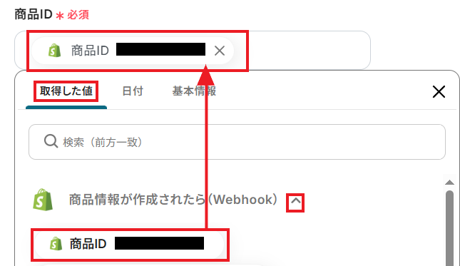 「商品ID」には、先ほどのトリガーで検知したShopifyの商品IDを取得した値から選択しましょう。