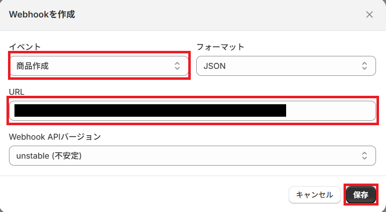 Shopifyの「設定」セクションから「通知」タブをクリックし、新しくWebhookを作成すると以下の画面が出てきます。 ここにコピーしたYoomのWebhookURLをペーストし、「イベント」のドロップダウンを必ず「商品作成」にして「保存」ボタンを押しましょう。