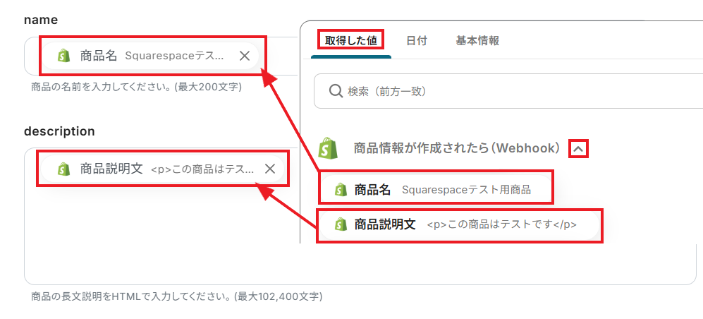 ここにも取得した値を設定することで、新しくShopifyで商品が作成される度、新しい商品の情報がSquarespaceに連携されるようになります。