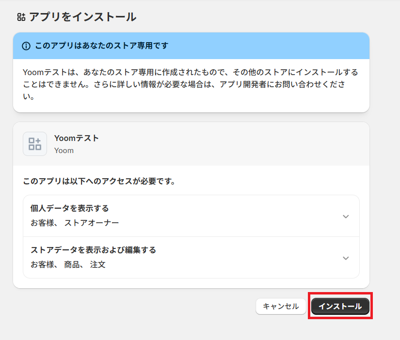 手順通りに進められていれば、Shopifyのサイトに遷移して以下の画面が表示されます。「インストール」ボタンを押してください。