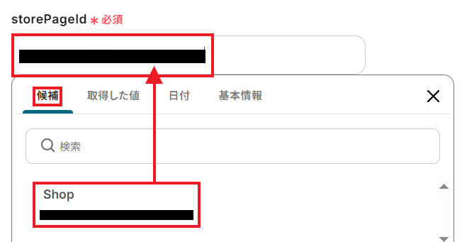 「storePageId」には、連携しているSquarespaceから表示される候補の中から任意のものを選びましょう。