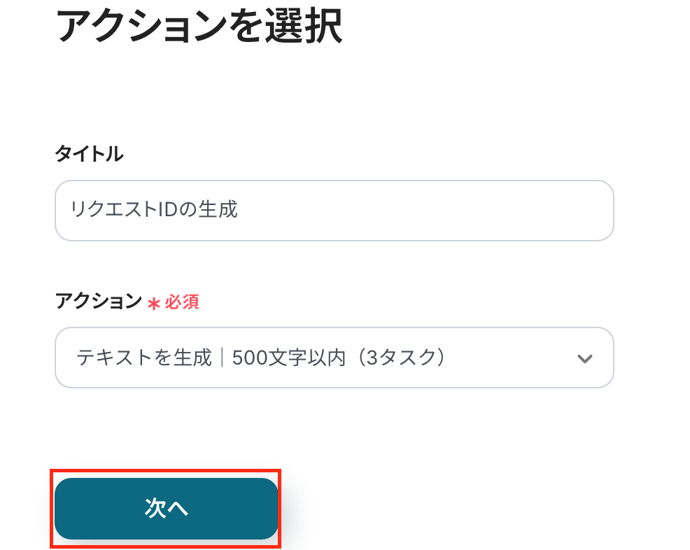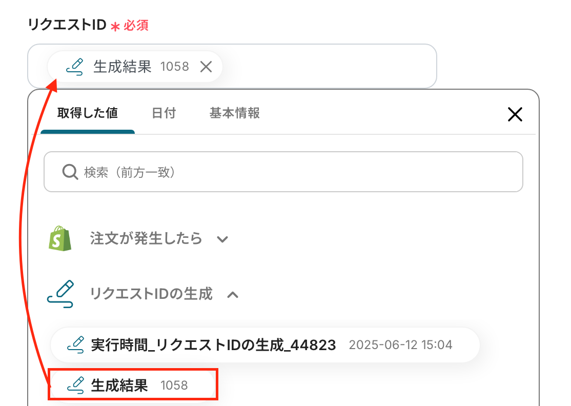 - リクエストID:入力欄をクリックして表示される「リクエストIDの生成」から「生成結果」を選択