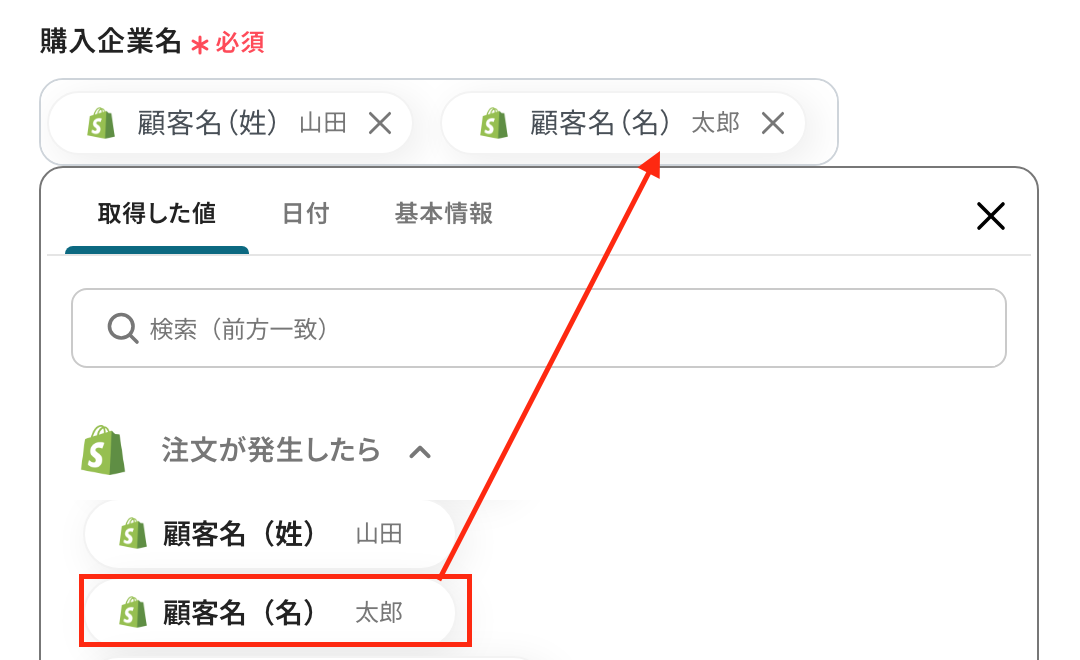 - 購入企業名:入力欄をクリックして表示される「注文が発生したら」から選択