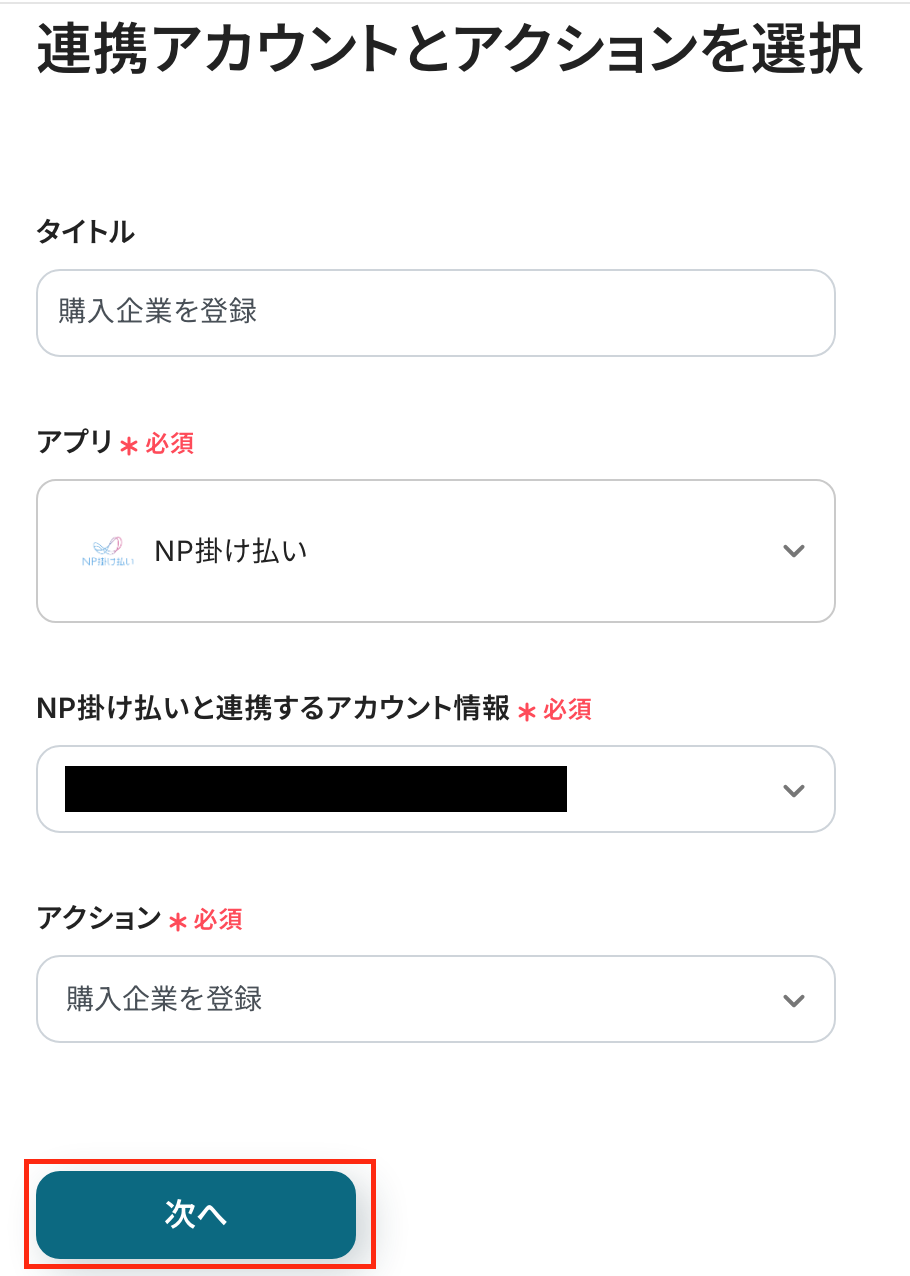 タイトルと連携するアカウント情報を設定し、アクションはテンプレート通りのまま「次へ」をクリックして進んでください。