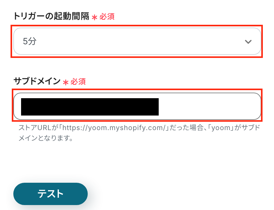 必須項目の入力を終えたら、「テスト」をクリックします。